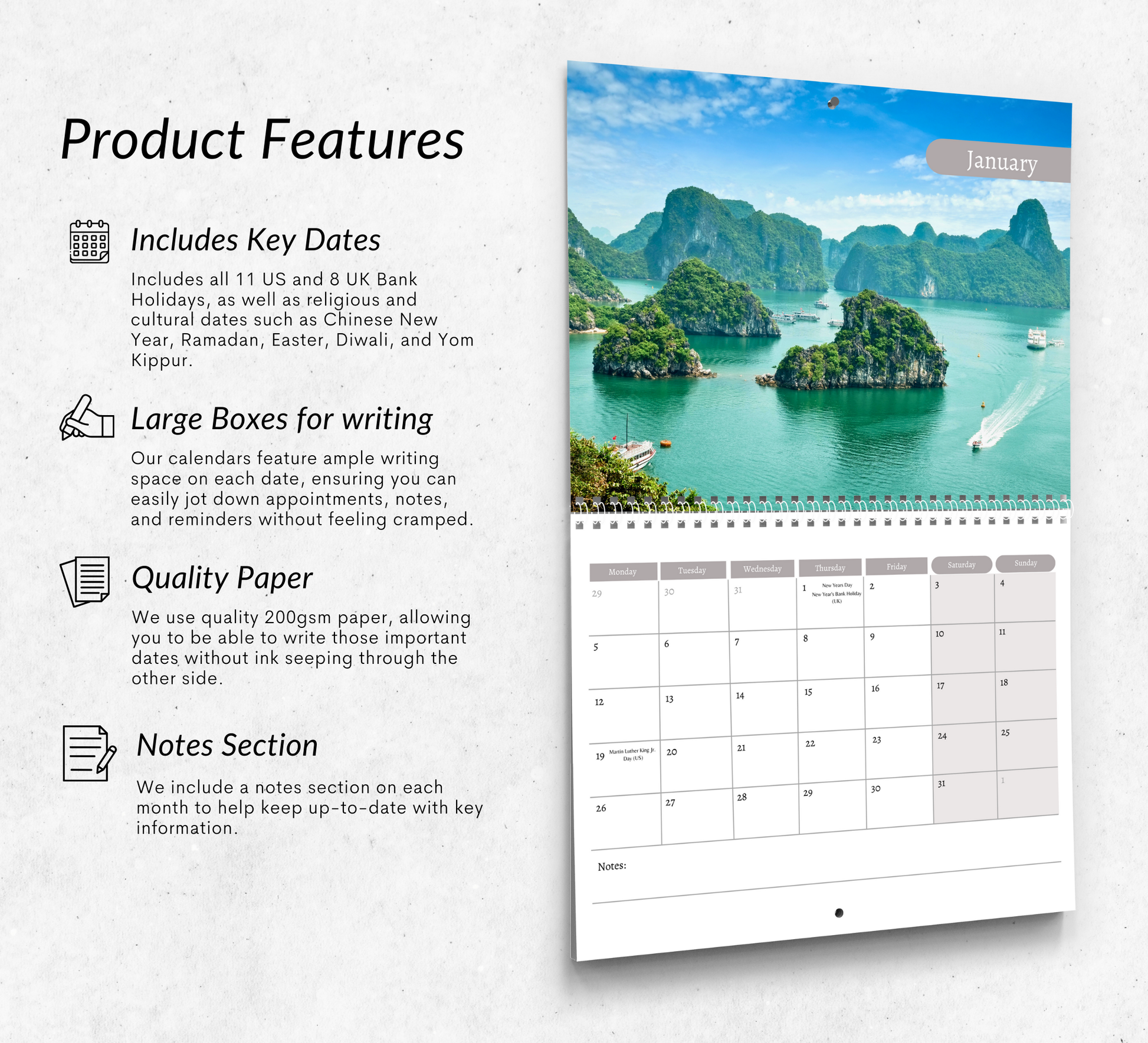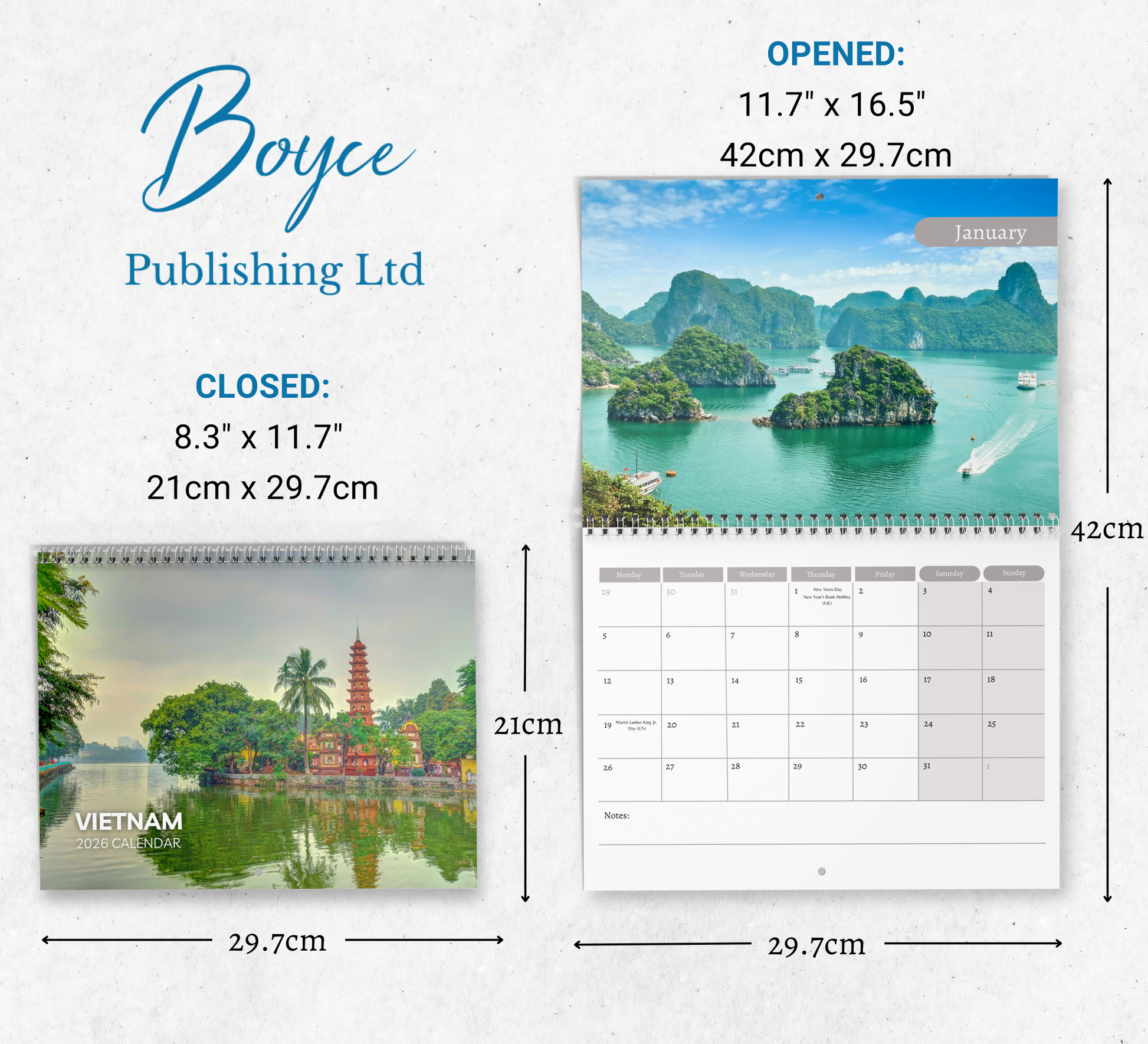 Each page features a vibrant, full-color Vietnam images paired with a spacious monthly grid for notes and appointments. Brightens your kitchen, living room, office, or classroom with elegant charm.