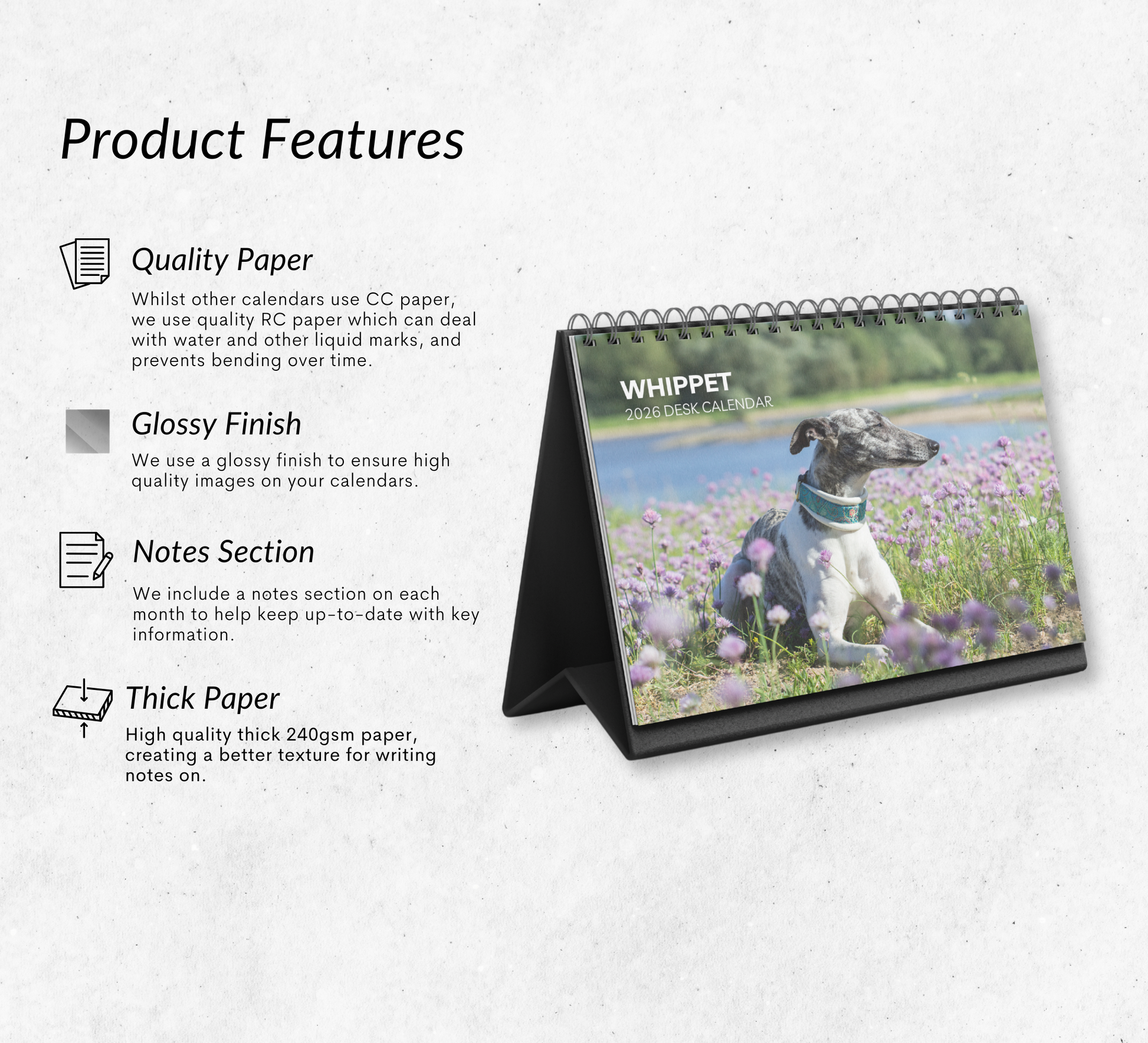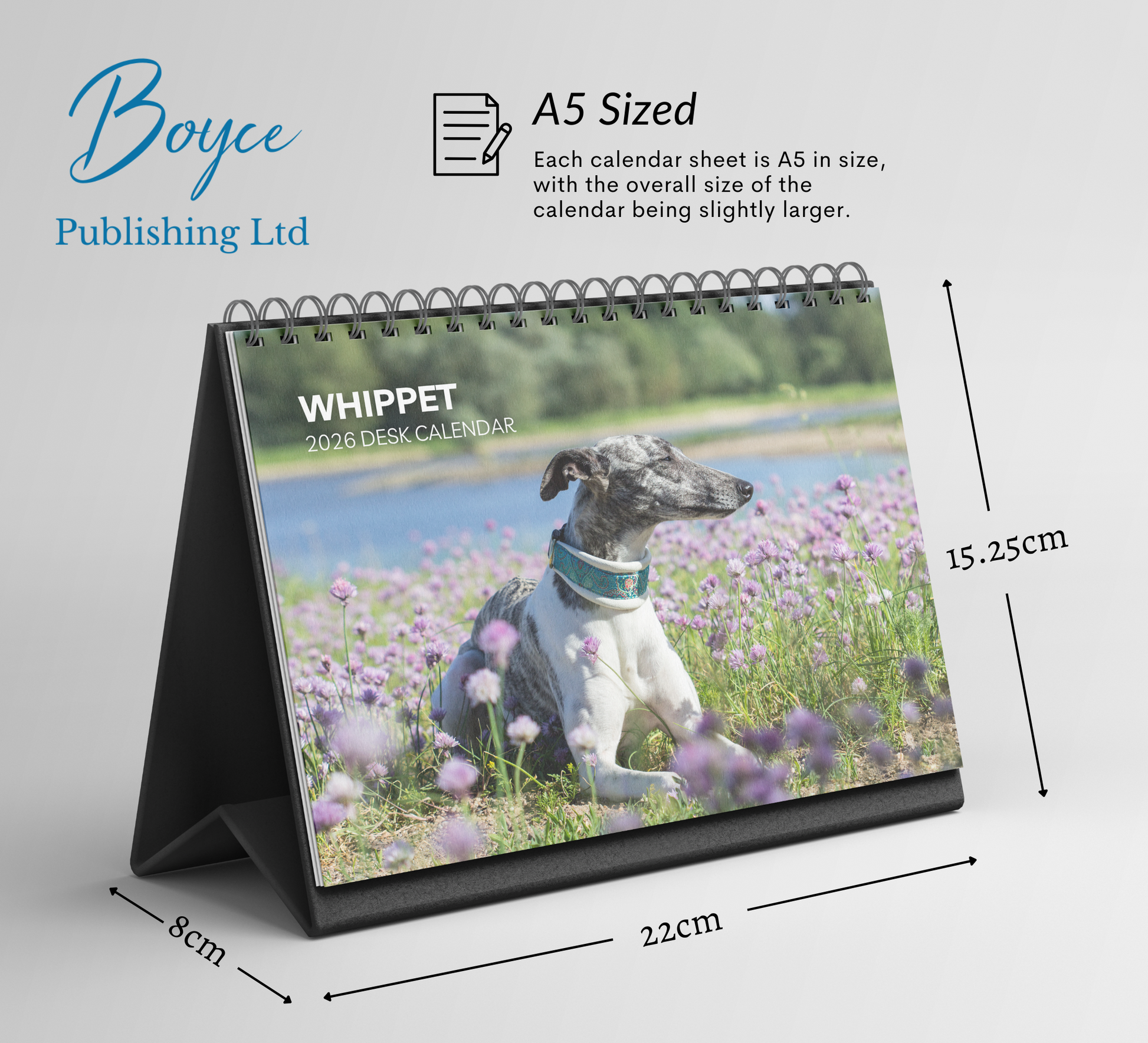 Keep your schedule on track with this beautiful 2026 Whippet desk calendar. Featuring ample space for notes, appointments, and reminders, each month is thoughtfully designed to help you stay organized with ease.