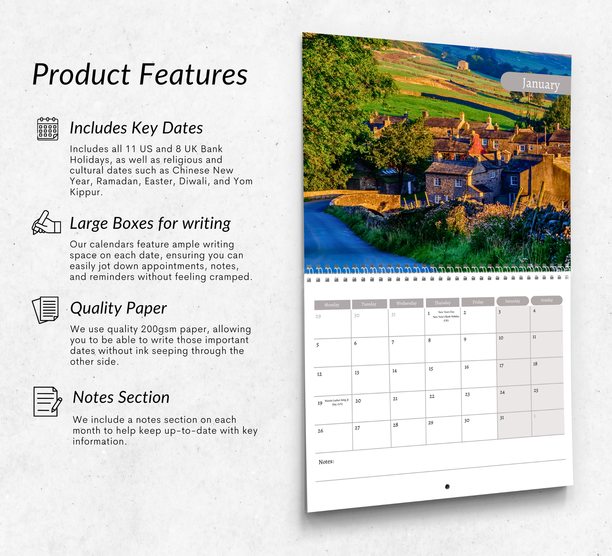 Each page features a vibrant, full-color Yorkshire Dales images paired with a spacious monthly grid for notes and appointments. Brightens your kitchen, living room, office, or classroom with elegant charm.